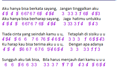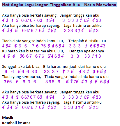 Not Angka Lagu Jangan Tinggalkan Aku Nazia Marwiana Dunia Lirik Not Lagu - .sayang jaga hatimu untukku tiada cinta yang seindah kamu tetaplah di sisiku kuharap kau bisa terima aku dengan apa adanya sungguh aku tak bisa bila harus menjauh dari kamu tiada yang sempurna tiada yang seindah cinta kamu aku hanya bisa berkata sayang jangan tinggalkan aku.